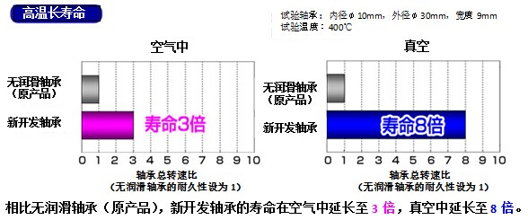 (1)400℃以下的高溫環(huán)境下,相對于無潤滑軸承,壽命最長延至其8倍。