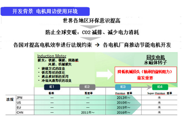 SIAIF推出可有效減少工業(yè)電機(jī)電力消耗的軸承占40%,目前該產(chǎn)品已開(kāi)始銷(xiāo)售。 隨著世界范圍內(nèi)環(huán)保意識(shí)的提高,所有產(chǎn)業(yè)均在推進(jìn)二氧化碳的減排和電力的節(jié)能。尤其是給泵、送風(fēng)機(jī)及壓縮機(jī)等機(jī)械提供驅(qū)動(dòng)力的工業(yè)電機(jī),其電力消耗占世界消耗總電量的40%以上。針對(duì)這些需求,各國(guó)均制定了旨在提高工業(yè)電機(jī)效能的相關(guān)法規(guī)。