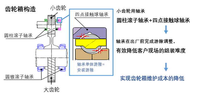 小齒輪使用圓錐滾子軸承時(shí),需要在齒輪箱組裝時(shí)由齒輪箱生產(chǎn)方或維修方完成軸承游隙的調(diào)整。而本次開發(fā)的新產(chǎn)品(包含四點(diǎn)接觸球軸承,以及與之配合使用的圓柱滾子軸承),則由SIAIF在軸承出廠前完成游隙調(diào)整,從而有效降低客戶現(xiàn)場(chǎng)的組裝難度,實(shí)現(xiàn)齒輪箱維護(hù)成本的降低。